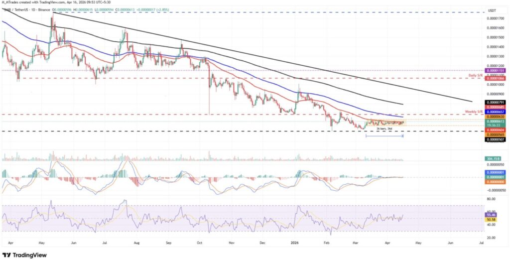 Jakarta, Pintu News – Harga Shiba Inu mendekati level resistance utama, diperdagangkan pada $0.0000060 pada 16 April 2026, yang mana akan menentukan arah pergerakan selanjutnya.