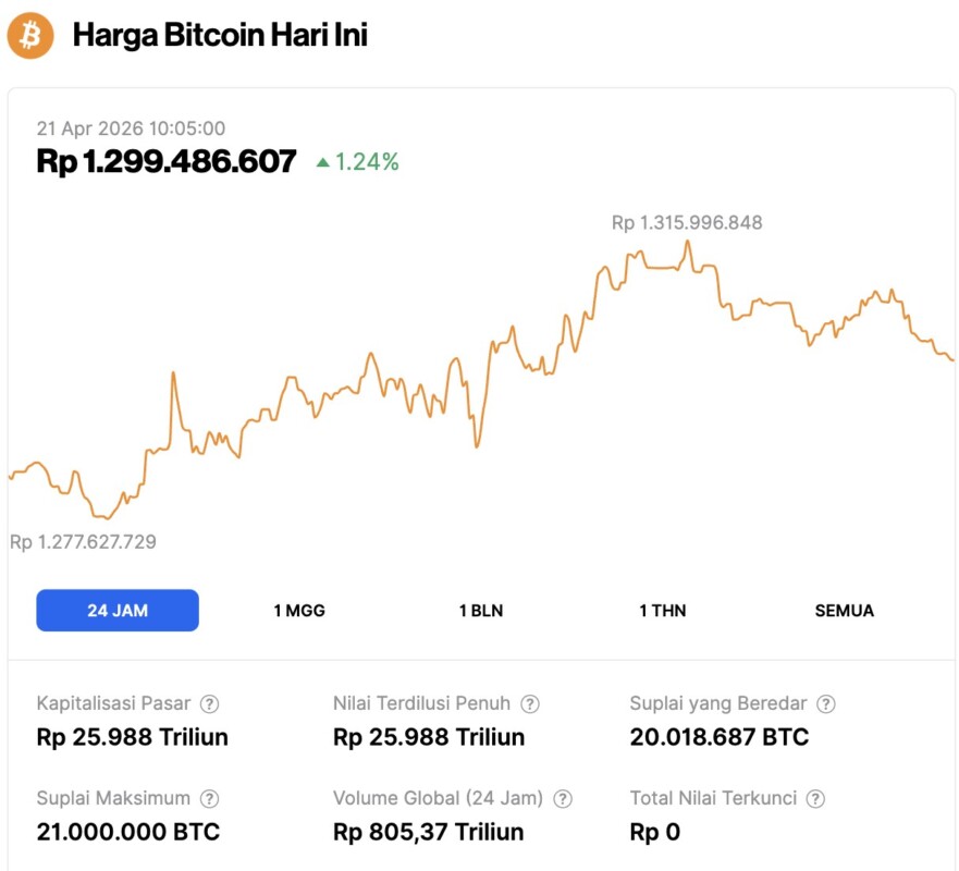 Pada 21 April 2026, harga Bitcoin tercatat berada di level $75,608 atau setara dengan Rp1.299.486.607, mengalami kenaikan 1,24% dalam 24 jam terakhir. Sepanjang periode ini, BTC menyentuh level terendahnya di Rp1.277.627.729 dan harga tertingginya di Rp1.315.996.848.