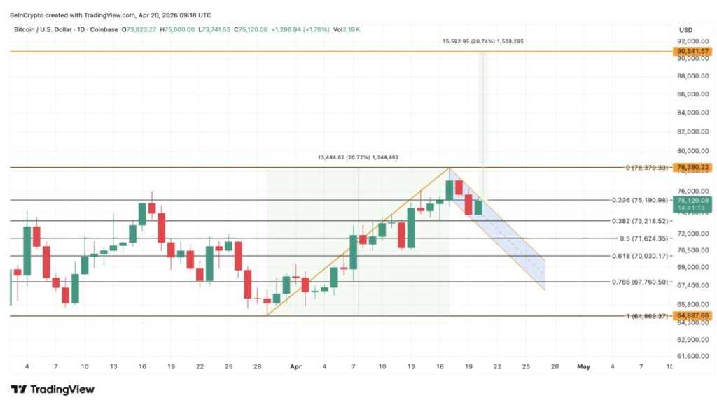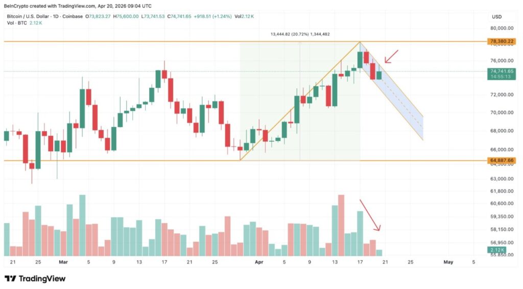 Bitcoin menguat 20,72% dari titik terendahnya pada 29 Maret menuju puncaknya pada 17 April di $78.380, sebuah pergerakan tiang (pole move) sebesar 13.444 poin dalam waktu sekitar tiga minggu.