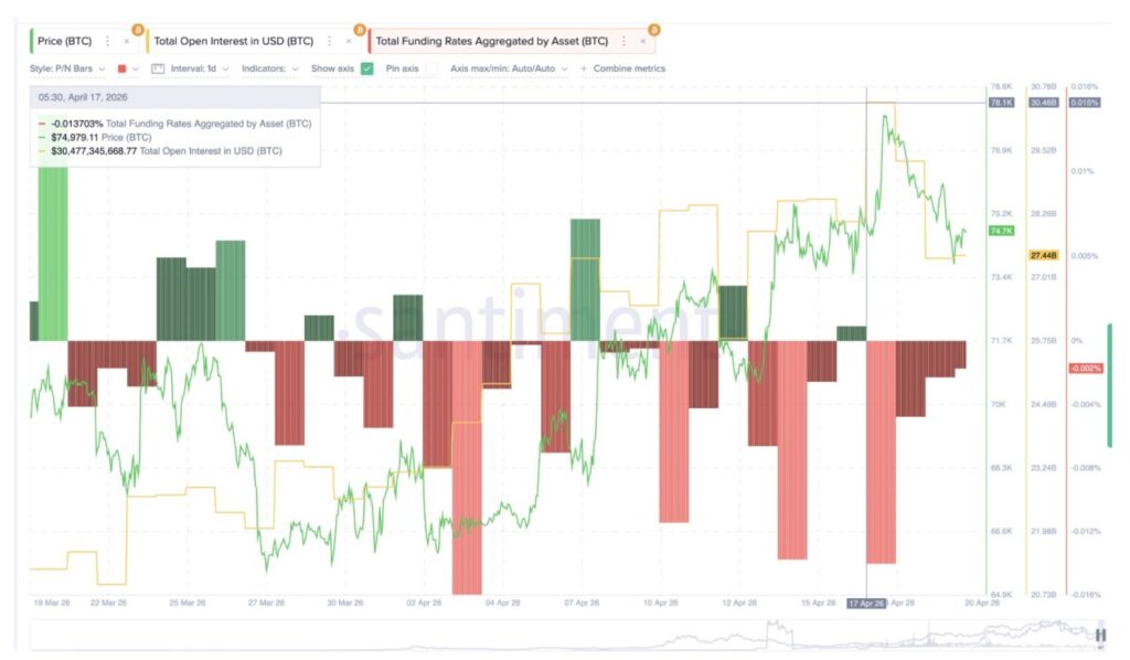 Sejak puncak 17 April, open interest Bitcoin—total nilai dolar dari posisi kontrak berjangka abadi (perpetual futures) yang belum ditutup—telah turun dari $30,46 miliar menjadi $27,44 miliar. Angka tersebut menunjukkan penurunan sekitar 10% di sepanjang tiga sesi perdagangan.