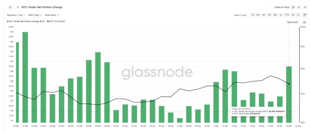 Hodler Net Position Change, sebuah metrik dari Glassnode yang mengukur seberapa banyak pemegang jangka panjang melakukan akumulasi setiap harinya, telah menanjak dari 32.942 BTC pada 17 April menjadi 36.482 BTC pada 19 April. Hal ini menandai lonjakan akumulasi hodler sebesar 10,75% dalam tiga sesi perdagangan, sebuah ayunan pergerakan yang terbilang besar untuk skala Bitcoin.