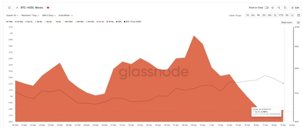 Identitas para penjual menjadi lebih jelas ketika kita membandingkannya dengan HODL Waves, sebuah grafik distribusi dari Glassnode yang membagi pasokan beredar berdasarkan kelompok usia dompet. Kelompok usia 1 minggu hingga 1 bulan, yang menangkap pergerakan pembeli spekulatif terbaru, mencapai puncaknya mendekati 4% pada 9 April dan sejak saat itu telah merosot menjadi 2,781% pada 19 April.