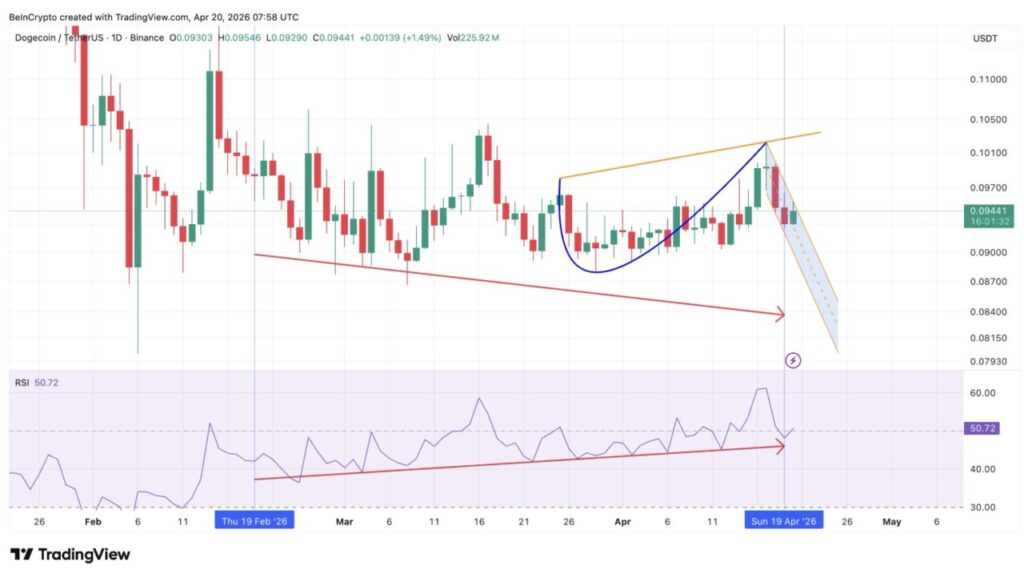 Divergensi RSI yang bullish semakin memperkuat pengaturan ini. Antara 19 Februari dan 19 April, DOGE mencetak level terendah yang semakin rendah (lower lows) secara bertahap, sementara Relative Strength Index (RSI), sebuah osilator momentum, justru mencatat level terendah yang semakin tinggi (higher lows).