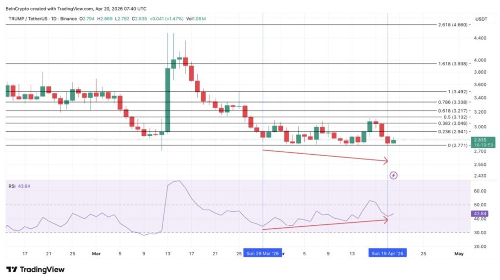 Divergensi RSI yang bullish mendukung argumen terjadinya rebound (pantulan naik) menjelang acara tersebut. Antara 29 Maret dan 19 April, harga TRUMP mencatat level terendah yang semakin rendah (lower low) sementara RSI mencetak level terendah yang semakin tinggi (higher low). Harga dan momentum bergerak ke arah yang berlawanan, yang mana secara historis membuka peluang terjadinya pantulan pembalikan rata-rata (mean-reversion bounce).