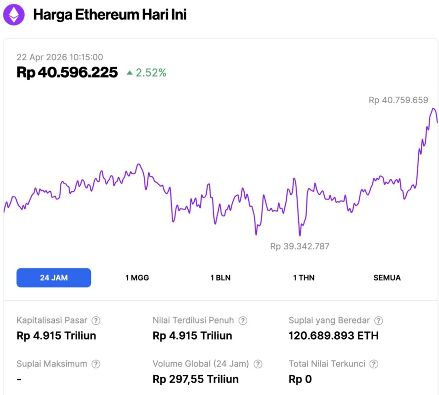 Pada 22 April 2026, harga Ethereum tercatat berada di sekitar $2,370 atau setara dengan Rp40.596.225, mengalami kenaikan 2,52% dalam 24 jam terakhir. Sepanjang periode ini, ETH sempat menyentuh level terendahnya di Rp39.342.787 dan level tertingginya di Rp40.759.659.