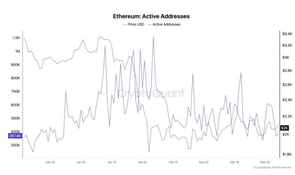 Alamat aktif adalah salah satu indikator penting yang mengukur pertumbuhan platform. Data on-chain dari Cryptoquant mengungkapkan bahwa alamat aktif Ethereum tetap volatil tanpa tren kenaikan yang jelas. Meskipun terdapat lonjakan aktivitas secara berkala, lonjakan tersebut gagal bertahan, yang menunjukkan bahwa keterlibatan pengguna tidak meluas secara berarti.