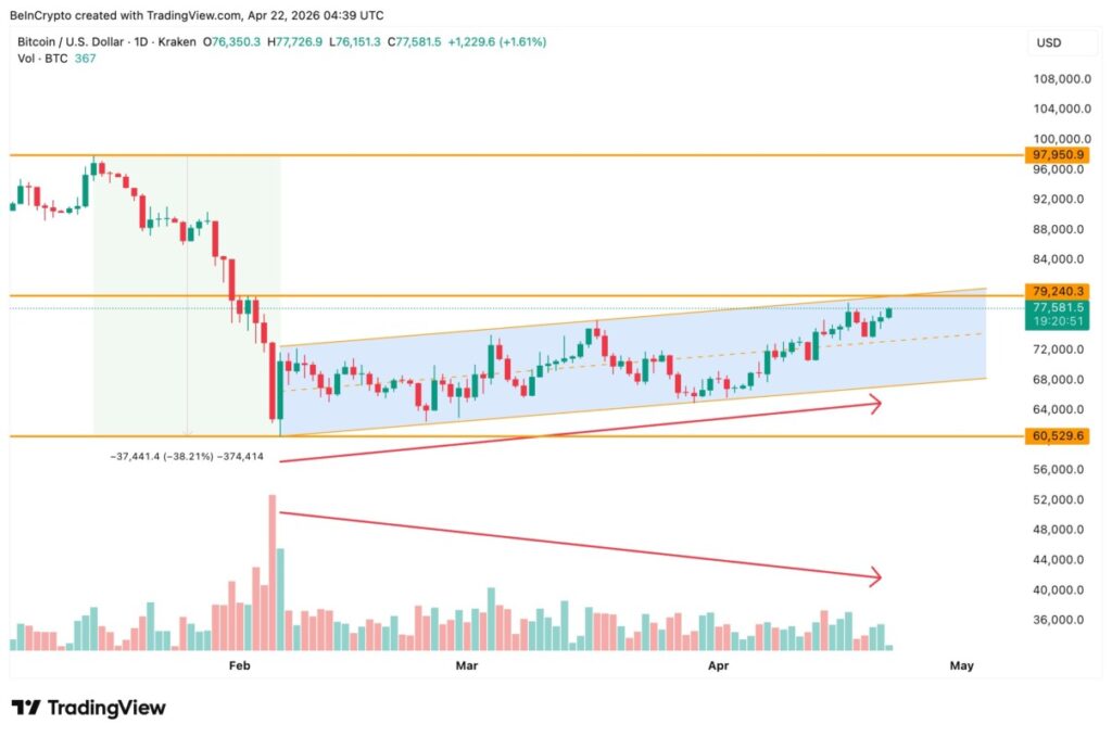 Setelah anjlok drastis di awal tahun, Bitcoin kini bergerak naik di dalam sebuah saluran menanjak (ascending channel) yang sering kali menipu mata pemula. Meskipun terlihat bullish, pola ini sebenarnya berfungsi sebagai pola korektif yang biasanya berlanjut ke arah tren aslinya, yaitu turun, kecuali jika ada penembusan kuat ke atas. Kamu harus memperhatikan bahwa volume perdagangan justru cenderung menurun saat harga mencapai level yang lebih tinggi di dalam saluran ini.