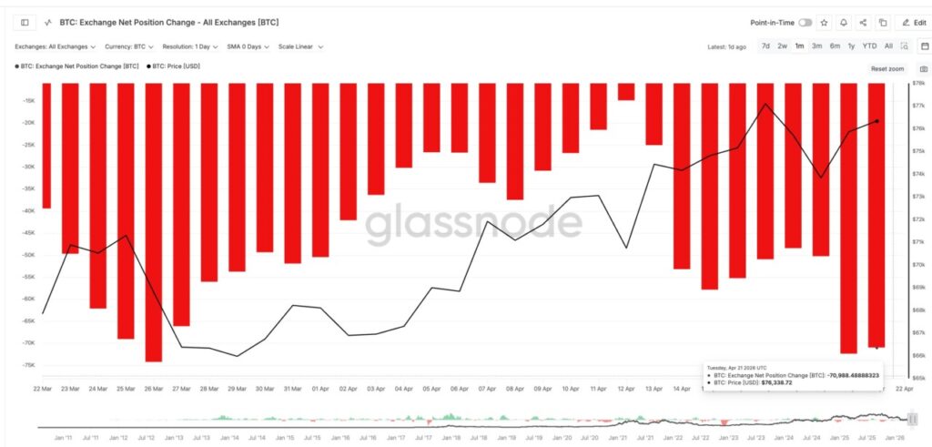 Data menunjukkan adanya percepatan besar dalam penarikan Bitcoin dari dompet bursa ke penyimpanan dingin (cold storage). Pada 21 April 2026, arus keluar bersih mencapai -70.988 BTC, yang biasanya dianggap sebagai sinyal akumulasi bullish oleh para investor besar. Namun, jika dikaitkan dengan struktur gap on-chain yang masih lebar, aksi beli agresif ini justru berpotensi menjadi jebakan bagi mereka yang membeli di harga lokal yang tinggi.