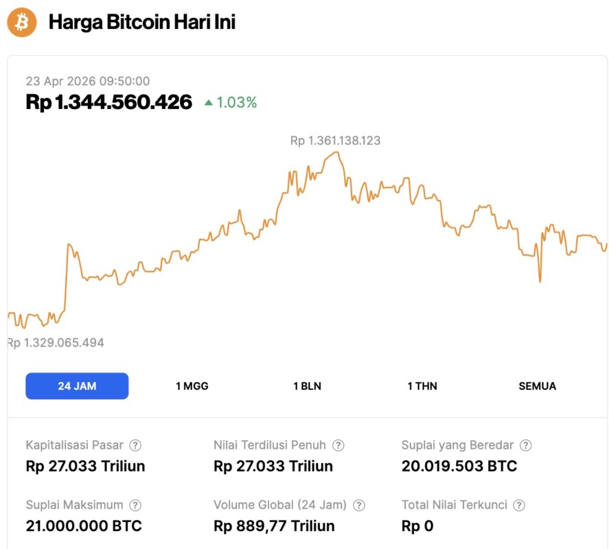 Pada 23 April 2026, harga Bitcoin tercatat berada di level $77,915 atau setara dengan Rp1.344.560.426, mengalami kenaikan 1,03% dalam 24 jam terakhir. Sepanjang periode ini, BTC menyentuh level terendahnya di Rp1.329.065.494 dan harga tertingginya di Rp1.361.138.123.