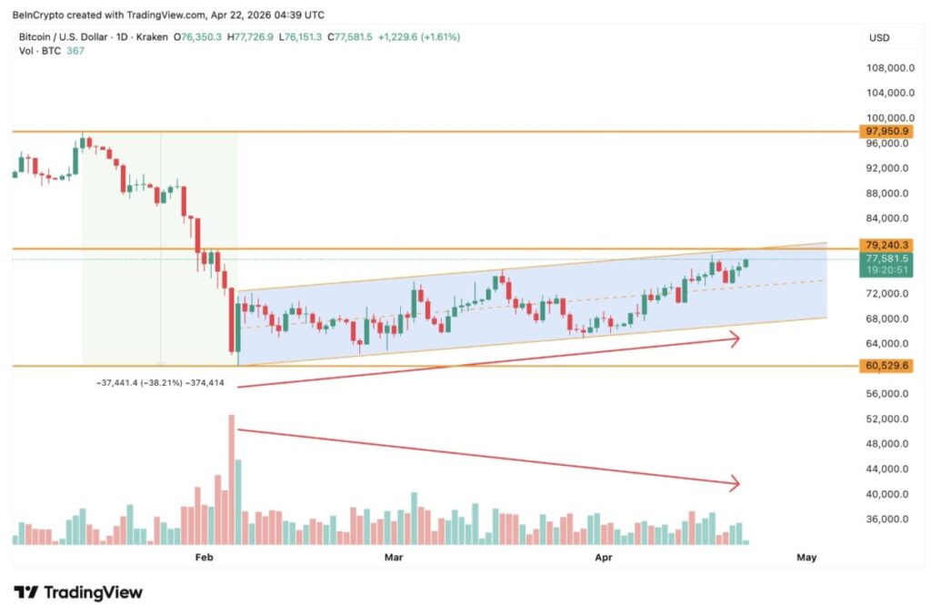 Volume perdagangan menceritakan kisah yang lebih mengkhawatirkan. Antara 6 Februari dan 21 April, harga memiliki tren naik sementara volume candle hijau justru menunjukkan tren menurun. Setiap level tertinggi baru yang berturut-turut di dalam saluran tersebut dibeli dengan komitmen dolar yang semakin sedikit, relatif terhadap level tertingginya. Pola itu sejalan dengan keyakinan pasar yang memudar, alih-alih sebuah pembalikan arah (reversal) yang berkelanjutan.