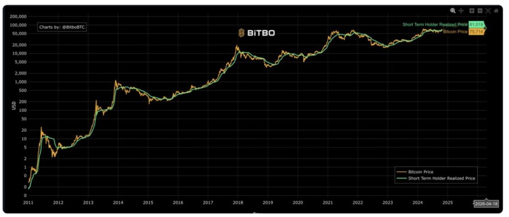 Realized Price (Harga Realisasi) Pemegang Jangka Pendek (STH), yang melacak rata-rata basis biaya dari dompet yang memegang Bitcoin kurang dari 155 hari, berada di angka $81.019.