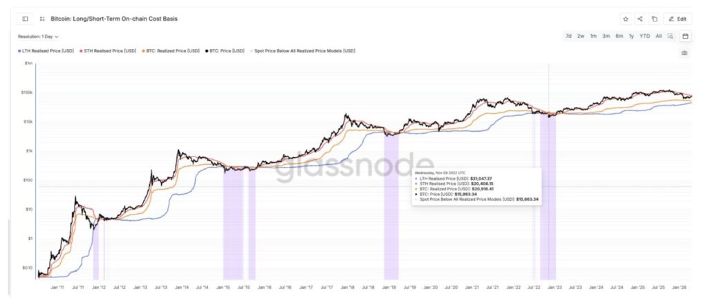 Kesenjangan itu sendiri bukanlah peringatannya. Yang terpenting adalah bahwa setiap bear market Bitcoin sejak 2015 baru berakhir hanya setelah selisih ini menyusut tajam, dengan Realized Price STH jatuh ke bawah Realized Price LTH.