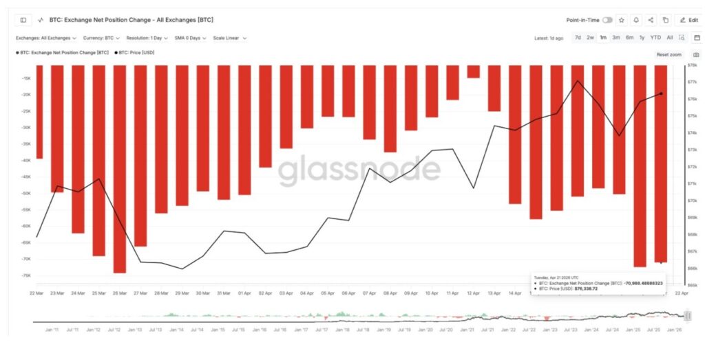 Pada tanggal 12 April, angkanya berada di -14.850 BTC, yang berarti terjadi arus keluar bersih (net outflows). Menjelang 21 April, angkanya telah bergerak ke -70.988 BTC, sebuah akselerasi hampir lima kali lipat dalam aktivitas penarikan spot.