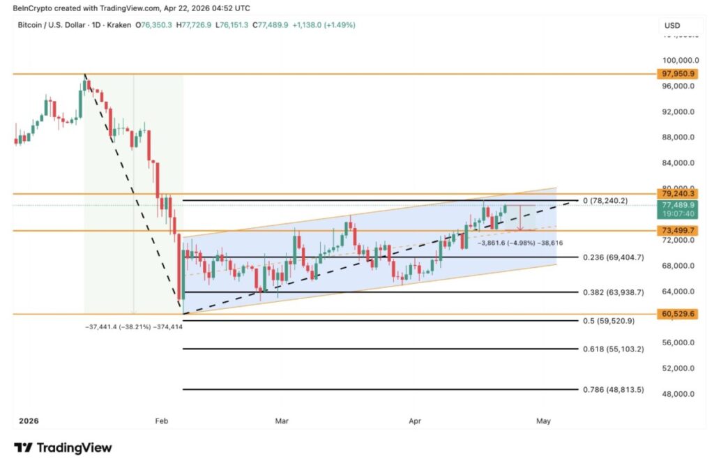 Untuk sisi atas, harga Bitcoin memerlukan penutupan harian di atas $78.240, yang merupakan level referensi swing-high terdekat, diikuti oleh $79.240 pada batas atas saluran. Level $79.240 berada di dekat retracement 50% dari keseluruhan penurunan pada periode Januari hingga Februari.