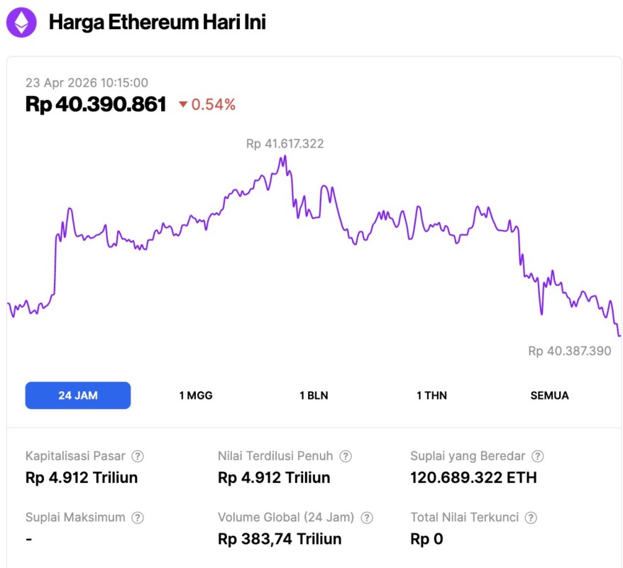 Pada 23 April 2026, harga Ethereum tercatat berada di sekitar $2,341 atau setara dengan Rp40.390.861, mengalami koreksi 0,54% dalam 24 jam terakhir. Sepanjang periode ini, ETH sempat menyentuh level terendahnya di Rp40.387.390 dan level tertingginya di Rp41.617.322.