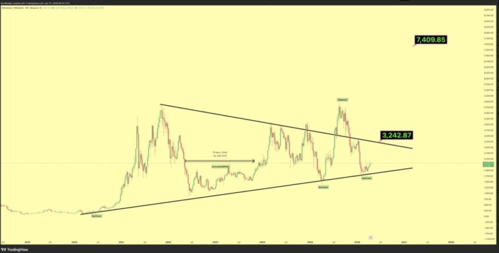 Pada saat yang sama, grafik ini menunjuk pada level 3.242,87 sebagai area resistensi penting di dekat batas atas. Jika Ethereum menembus ke atas wilayah tersebut dan mempertahankannya, analis menyarankan bahwa target kenaikan yang lebih besar berikutnya dapat meluas menuju 7.409,85. Namun, ini tetap merupakan sebuah proyeksi berdasarkan struktur wedge, bukan sebuah pergerakan yang telah terkonfirmasi.