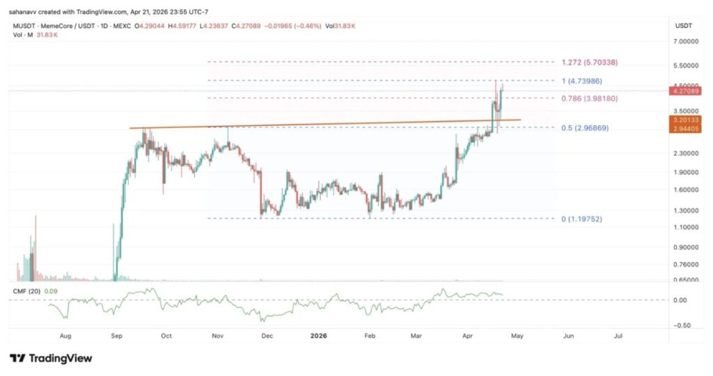 Memecore saat ini berada dalam fase breakout (penembusan harga) yang kuat, namun mulai mendekati titik penentuan. Harga secara impulsif telah bergerak di atas level Fibonacci 0,5 dan bahkan sempat menyentuh zona 0,786–1,0 ($3,98–$4,73), sebelum akhirnya mengalami penolakan (rejection). Struktur trennya masih bullish, dan indikator CMF yang tetap positif mengonfirmasi adanya arus dana masuk (inflows) yang nyata.