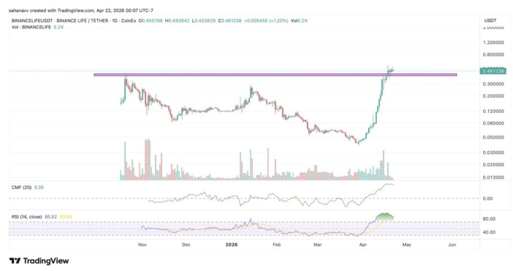 Harga Binance Life telah anjlok hampir 7% dalam 24 jam (22/4), sementara dalam tujuh hari terakhir, token ini telah meraup keuntungan lebih dari 56%. Lonjakan ini terutama didorong oleh rumor tentang pencatatan (listing) di bursa seperti Binance, KuCoin, atau lainnya.