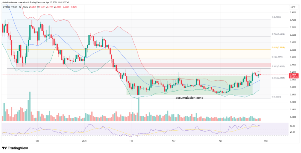 SPX6900 (SPX) saat ini berada di kisaran $0,3839 setelah mencatat kenaikan mingguan sebesar 19%, meniru pola yang pernah terjadi di awal tahun. Harga berhasil keluar dari channel akumulasi antara $0,27 hingga $0,35 yang bertahan sejak Februari hingga pertengahan April. Tantangan berikutnya adalah resistance Fibonacci 0,382 di $0,426, area di mana penjual sebelumnya sering menahan laju kenaikan.