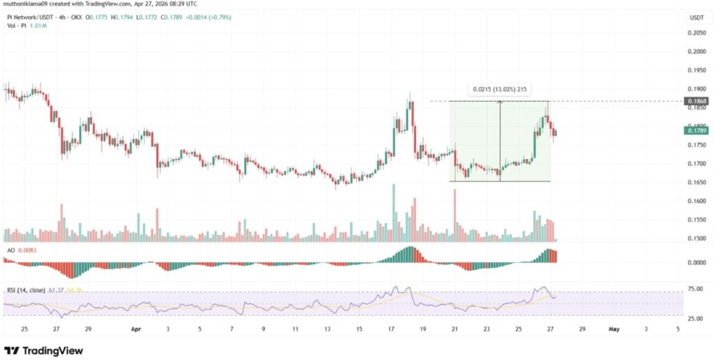 Jakarta, Pintu News – Harga Pi Network telah melonjak lebih dari 2% pada 27 April, dan sempat diperdagangkan pada level $0,183. Volume perdagangan juga melonjak 27% menjadi $30 juta. Kenaikan ini terjadi menjelang tenggat waktu pembaruan (upgrade) Protokol 22, yang diharapkan dapat mendorong kenaikan harga lebih lanjut.